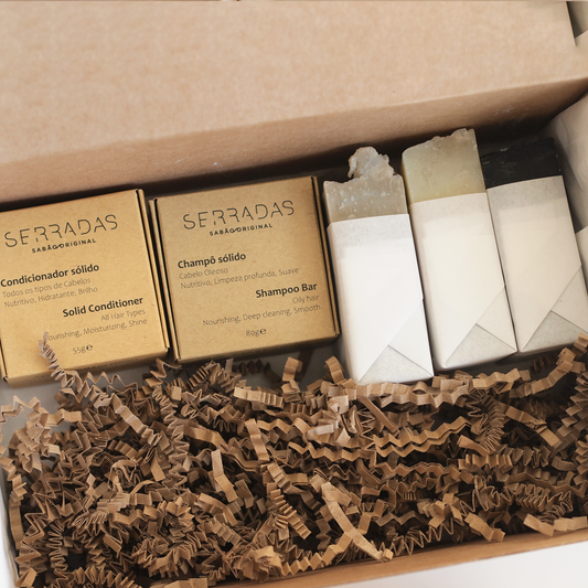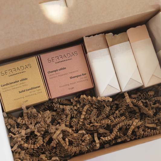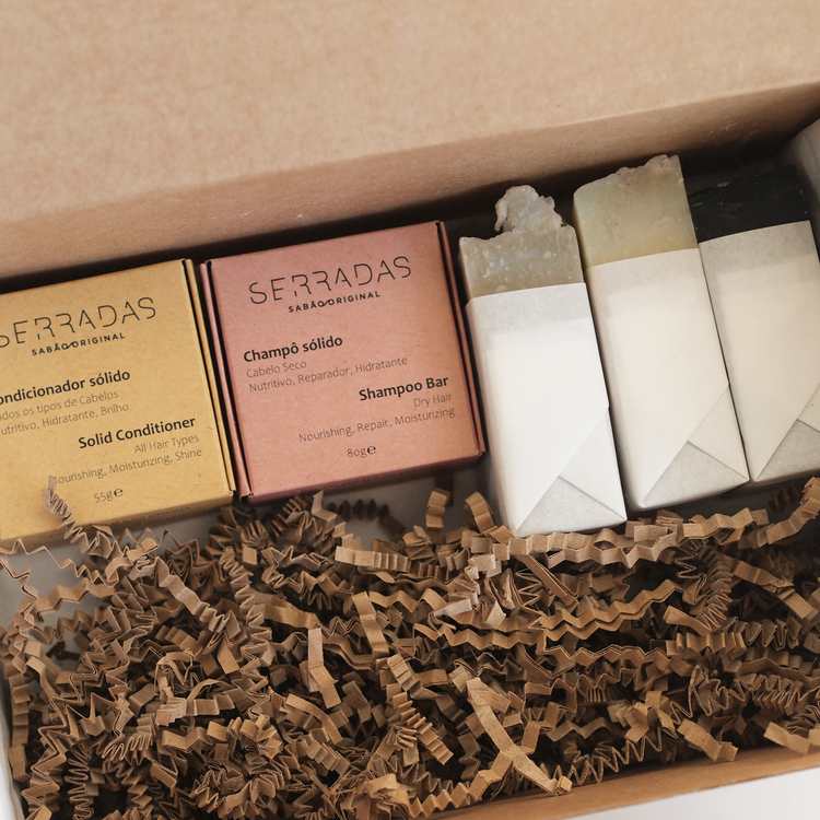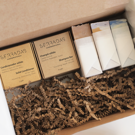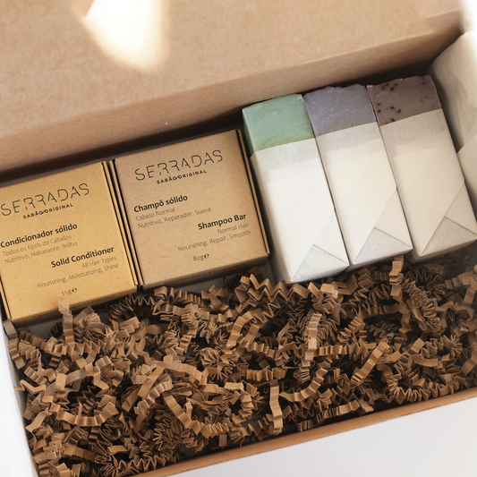 Estes kits de 3 sabonetes, 1 champô e 1 condicionador sólido estão agrupados por tipo de pele Normal, Seca, Oleosa ou Sensível.